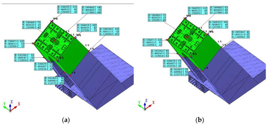 Figure 14 shows a distribution of the variations in the feature points of the upper port relative to the optimal assembly attitude of component GTS8 and the variations in the feature points of the lower port relative to components of GTS5 and GTS7, assembled with the optimal number of alternate sides for the connected ports. The variations in the feature points of the upper port, relative to the optimal assembly attitude, correspond to Table 7. Likewise, variations in the feature points of the lower port, relative to assembly components GTS5 and GTS7, correspond to Table 6. Variations in the table refer to the local coordinate system. The value of the overlap of the normal vector indicates the value of the difference in the local coordinate system on the z-axis between the upper and lower ports’ feature points. A negative value indicates overlap, i.e., the length does not reach the target. Similarly, a positive value indicates a gap, i.e., the lengths of the upper and lower components are shorter than those of the target. If the port of GTS8 can reach the variation state shown in Figure 14a, the overlap area of the upper and lower component connecting ports should be eliminated; otherwise, GTS8 cannot reach the predicted position due to the component’s length. Therefore, the normal vector’s overlap quantity for the corresponding feature points of the connected ports in the table is the quantity of the adjustment of the component length. Because components GTS5 and GTS7 are set up while GTS8 is still being set up in the factory, cutting is carried out on each corner point of the lower port of component GTS8. The predicted variation distribution after cutting is shown in Figure 14b. After processing and adjusting GTS8 according to the normal vector overlap quantity provided in the table, the measured variation in the upper end of the site after assembling and positioning is shown in Figure 15. The variation is close to the prediction variation, and the maximum variation of the axis variation is only 4 mm, indicating that the proposed method can effectively guide the site assembly of the component.
