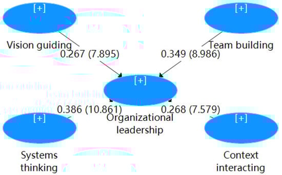 Outer weights and p values for the first-order (reflective) dimensions must be reported in accordance with the standards for evaluating formatively models [52,54]. The relevance of organizational leadership (second-order formative) and its dimensions (first-order reflective), as determined by outer weights and P values, are presented in Figure 2 and Table 6. It can be seen from Table 6 that organizational leadership is measured by four dimensions, including vision guiding, systems thinking, team building, and context interacting. Organizational leadership dimensions, i.e., systems thinking ( = 0.349, p < 0.01) and team building ( = 0.349, p < 0.01), show the higher contributions to organizational leadership, followed by context interacting ( = 0.268, p < 0.01) and vision guiding ( = 0.267, p < 0.01).