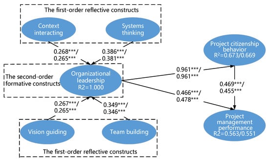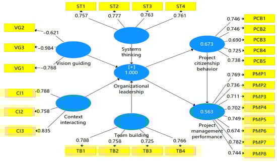 Organizational leadership is a key factor affecting the management performance of complex construction projects, but seldom have studies attempted to explore the effect mechanisms of organizational leadership on the project management performance, especially the mediating role of project citizenship behavior. The purpose of this study is to fill this gap by investigating the effects of organizational leadership on project citizenship behavior and management performance in complex construction projects. The theoretical model is constructed based on a literature review, and exploratory factor analyses (EFA) are performed on 169 valid questionnaires collected to measure organizational leadership, then partial least squares-structural equation modeling (PLS-SEM) is used to test the hypotheses. The results show that (i) organizational leadership is measured as vision guiding, context interacting, team building, and systems thinking; (ii) vision guiding and context interacting have both direct and indirect effects on the project management performance, and team building can only improve the project management performance by influencing the project citizenship behavior, whereas systems thinking has no significant effect on project citizenship behavior and the project management performance in complex construction projects; (iii) and project citizenship behavior partly mediates the influence of organizational leadership on the project management performance, and the effect of organizational leadership on the project management performance is more realized through the mediating role of project citizenship behavior. The results have a significant theoretical and practical significance for improving the project management performance.