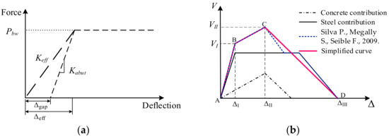Kabut is the adjusted initial stiffness of the backwall of the seat-type abutment. Keff is the effective abutment wall stiffness of the seat-type abutment accounting for the expansion hinge gaps. The simplified skeleton curve of the damaged backwall is divided into three sections: yield (AB line), hardening (BC line), and failure (CD line). The relationship between the shear force and displacement at three stages can be determined by Equations (1)–(4).