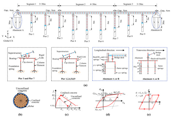 In addition, the modeling of abutment-soil-foundation-superstructure interactions is elaborated in the following Section 2.3. The finite element model of the entire bridge system is presented in Figure 3a. The fiber section, the stress-strain constitutive model of concrete and rebar, and the hysteresis model of pot-type bearings are exhibited in Figure 3c–e, respectively.