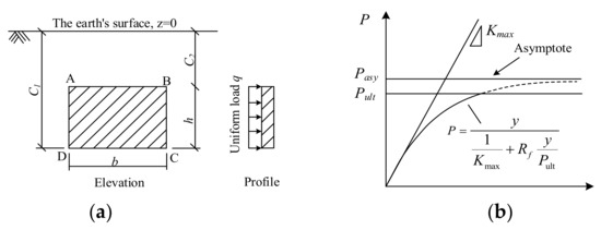 The initial stiffness Kmax was solved according to an elastic method proposed by Douglas et al. [27], as shown in Figure 4a. Rectangle ABCD represents a flat plate in an elastic semi-infinite space, with uniform distribution force q acting on one side of the flat plate. It is assumed that the soil on the other side is an elastic medium, which could be characterized by Young’s modulus and Poisson’s ratio. Then, the mean displacement of four points, namely yave, can be solved. Finally, the stiffness of the rectangular plate-fill system, Kmax, is calculated by Equation (6).