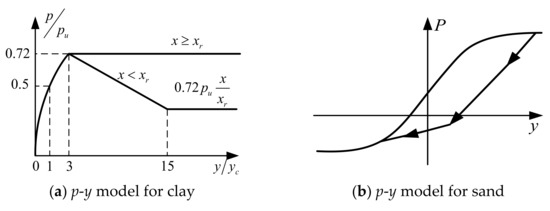 The lateral soil’s resistance on piles was modeled with nonlinear zero-length p¬-y springs. The nonlinearity of the p-y spring was considered by the PySimple1 material in OpenSees. The p-y model for clay was developed by the Matlock clay relationship [29], and the ultimate resistance for clay was determined by Equation (8).