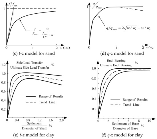 The axial soil resistance acting on the pile’s surface can be divided into two parts: axial adhesion between the pile and the surrounding soils and the end-bearing capacity at the pile’s tip. Similarly, nonlinear zero-length t-z and q-z springs are adopted to represent the relationship between the axial soil resistance and soil deflection. The nonlinear behavior of the t-z and q-z springs is considered by the TzSimple1 and QzSimple1 materials in OpenSees, respectively. The t-z model for clay follows Reese and O’Neill’s clay relationship, and the t-z model for sand follows Mosher’s sand relationship [32,33]. The q-z model for clay follows the Reese and O’Neill clay relationship, and the q-z model for sand follows Vijayvergiya’s sand relationship [34]. Figure 5a-f shows the values of the p-y, t-z and q-z models, respectively, in clay and sand.