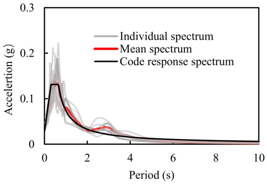 An adequate number of ground motions is necessary to obtain a realistic prediction of seismic responses for bridges. For this study, it is of great importance to obtain statistically stable average values of the structural response to draw reasonable conclusions about the global responses. The consensus that seven or more spectrum-compatible time histories are eligible for averaging was reached. For this reason, thirty typical ground motion records downloaded from the strong motion database in PEER were selected as inputs in the numerical analyses. The PGA (peak ground acceleration) ranged from 0.10 to 0.24 g. The moment magnitude ranged from 6.46 to 7.62. The range of distance from the epicenter was from 30.56 to 58.28 km. The selected bridge was located in a class II ground motion site in China, and its seismic fortification intensity was Ⅸ degree [37]. The design acceleration response spectra of the bridge site are shown in Figure 7. The mean spectra of the selected earthquake waves matched the design spectra well. Hence, all thirty records were scaled to a peak ground acceleration of 0.4 g. Since this study focuses on the longitudinal motion of the bridge girders, the vertical and horizontal components (in the transverse bridge direction) of ground motions were not accounted for. The characteristics of input ground motions selected for this research are presented in Table 3.
