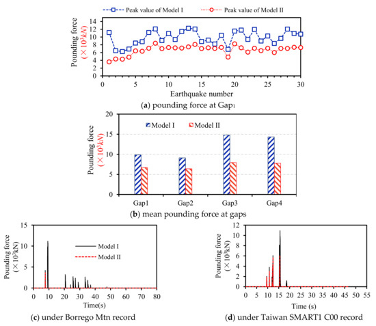 Figure 8a presents the peak pounding force at gap1 for the bridge models under thirty ground motions. It can be found from Section 3.5 that the bridge with a sacrificial abutment backwall (Model II) induces a much smaller pounding force response than the bridge with a linear elastic abutment backwall (Model I). Figure 8b exhibits the mean pounding force at four gaps for the bridge models, respectively. It is clear that the mean pounding force at gap1 between Segment 1 and abutment A is reduced from 9.86 × 103 kN (Model I) to 6.68 × 103 kN (Model II), with a decrease of 32.2%, and the mean pounding force between Segment 3 and abutment B is reduced from 9.12 MN × 103 kN to 6.43 × 103kN, with a decrease of 29.5%. The mean pounding force at gap2 between Segment 1 and Segment 2 is reduced from 14.80 × 103 kN (Model I) to 7.96 × 103 kN (Model II), with a decrease of 46.2%, and the mean pounding force at gap3 between Segment 2 and Segment 3 is reduced from 14.33 × 103 kN to 7.77 × 103 kN, with a decrease of 45.8%, which illustrates that it is of great benefit for the bridge to equip a sacrificial abutment backwall to mitigate the pounding between the abutment and bridge decks or adjacent decks.