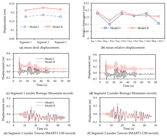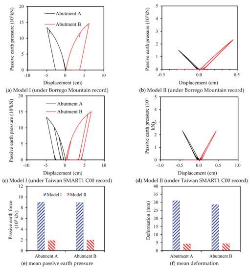 Figure 11e,f shows the mean passive earth pressure and deformation of the backfill for the two models. It is apparent that the mean passive earth pressure and deformation has a decreasing trend if the backwall is sacrificial (Model II) rather than linear elastic (Model I). This is because the superstructure transmits a large amount of seismic inertial force to the abutment through pounding when the backwall is a linear elastic member, and the backwall simultaneously transmits part of the seismic inertial force to the backfill. Therefore, the passive earth pressure and deformation of the abutment backwall-backfill system is relatively large, but when the abutment is designed as a sacrificial member in the analysis model, the pounding force probably causes the backwall to be destroyed. Then, the loss of the restraint of the abutment on the superstructure will reduce the rigidity of the structural system, making the seismic inertia force of the superstructure smaller. Hence, the passive earth pressure of the backwall-backfill system and deformation is significantly reduced.