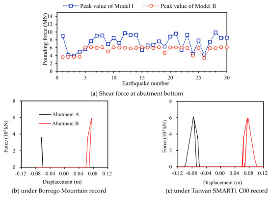 The peak shear force at abutment A at the bottom of the bridge models is shown in Figure 10a. It can be noticed that the shear force at the backwall’s bottom has a greatly decreasing trend when considering the damage to the abutment. In addition, the peak shear force in Model II is mostly about 6 × 103 kN, which is very close to the ultimate shear capacity at the backwall’s bottom (6.13 × 103 kN) calculated by Equation (2). Hence, the abutment reaches shear failure when excited by most selected ground motions.