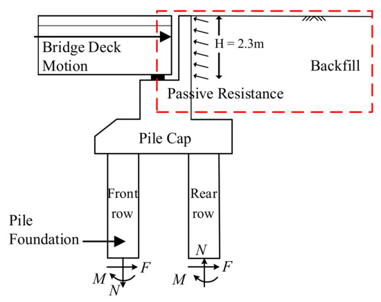 It is generally recognized that the huge impact between the beam and abutment changes the passive resistance of backfill, resulting in the permanent displacement of soil [4]. Then, the huge pounding force is partially transmitted to the pile foundation through the abutment breast wall, which may give rise to plastic damage to the pile foundation and its surrounding soils. Therefore, the seismic performance of the entire bridge system becomes highly nonlinear and is greatly dominated by the soil–structure interactions, embankment flexibility, and abutment behavior.