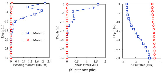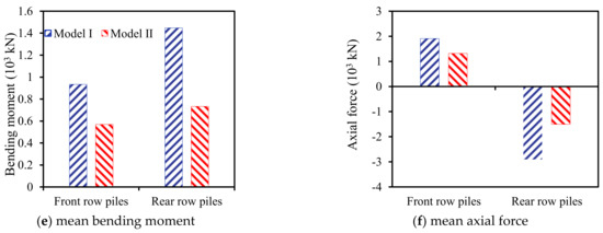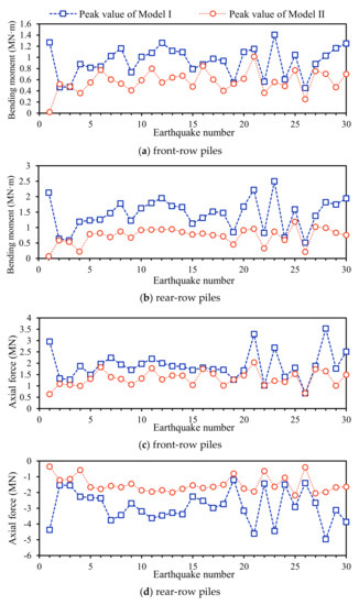 In terms of the selected bridge, the pounding makes the abutment lean back when pounding between the abutment and deck occurs. As shown in Figure 12, the axial force response of front and rear row piles is quite different: the seismic axial force of the front-row piles is a tensile force, while this force is compressive for the rear-row piles. Furthermore, rear-row piles have compression-bending components, while front-row piles are likely to become tension-bending components under a combination of seismic and dead load. Since the axial force has a greater influence on the bending bearing capacity of the member bar, this section will focus on the axial force and bending moment response for the pile foundation at its abutments.