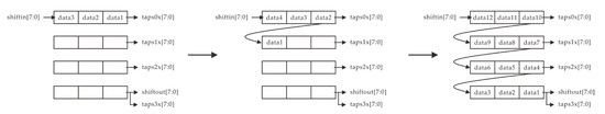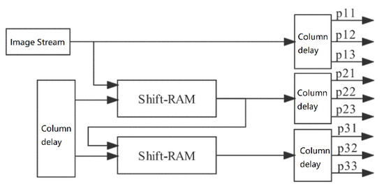 The key to the above laser spot image processing algorithm using an FPGA is the extraction of the sliding window [45]. In this study, we used a Shift-RAM shift register to implement extraction of the window template. As shown in Figure 4, a Shift-RAM shift register works as follows: set the number of lines and the width of each line, and when the next data input comes in, the previous data input goes forward; when the data input reaches the width of a line, the first data input goes into the next line shift storage, and so on, until the data window is filled. Quartus II software (13.1, Intel Corporation, Santa Clara, CA, USA) has its own Shift-RAM IP cores, which call two Shift-RAM IP cores to shift and store two lines of data to form a data window with the third line of newly entered data. The use of Shift-RAM IP cores in Quartus II requires that the parameters be set according to the window size.