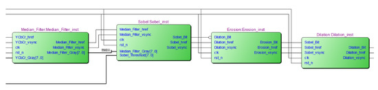 After extracting the sliding window, the FPGA-based laser spot image processing algorithm is implemented using the Verilog hardware description language according to the relevant formula in Section 3.1. The RTL generated after synthesis of the program is shown in Figure 6.