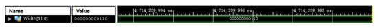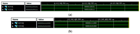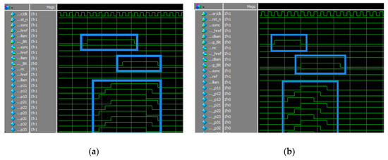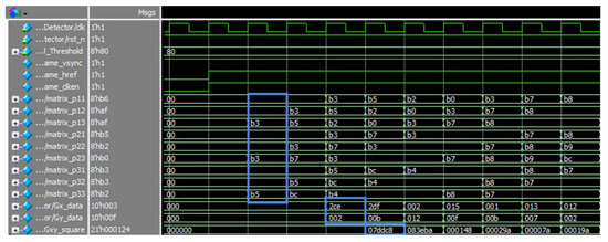 A joint simulation is performed using Quartus II and ModelSim (2020.4, Siemens Digital Industries Software, Plano, TX, USA). Following the simulation, the simulation waveforms of the module can be viewed as shown in Figure 7 and Figure 8. As shown by the blue block diagram in Figure 9, the results of the signal simulation data exemplified in the block diagram match those of the relevant image processing algorithm; thus, the module is verified via simulation.
