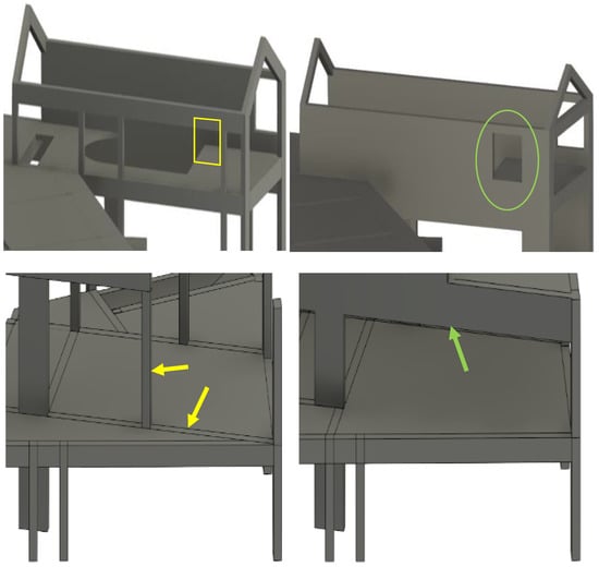 The project under analysis was submitted with changes made to the architecture design, while the structural model was being developed, compelling a series of adjustments over the structural solution. The most relevant project changes were analyzed, and the BIM models of the structures were adjusted according to the imposed modifications. The architect proposed some changes to the project, which in several situations led to problems that were difficult for the engineering office to solve (Figure 3):