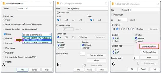 Figure 8. (A) Selected regulations; (B) Portuguese Standard NP ENV 1998-1-1 2000; (C) values adopted for seismic analysis.