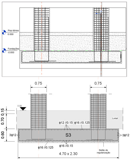 - The concrete used in the foundations is of class C25/30. The diameters of the rods were restricted to diameters with a current use in Portugal and some aspects such as the type of distribution and the mooring angles were defined. For the correct dimensioning and validation of the detailing of the reinforcements, two distinct foundations were considered, isolated and continuous (Figure 11).