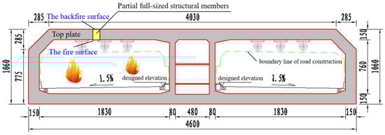 The project adopts the technical standard of a two-way eight-lane highway with a design speed of 100 km∙h−1 [22]. The immersed tube tunnel is laid out in the form of a large cross-section with two holes and a tube gallery, as shown in Figure 1. The dimensions of the standard tube section cross section are 46 m wide and 10.6 m high, and the top plate of the tube section is 1.5 m thick and designed with C50 high-strength concrete. The top plate of the immersed tunnel tube structure in the typical part subjected to fire was selected, and partial full-size test members were designed and built to conduct the fire test according to the actual construction requirements of the project. The tests were to simulate the state of the top plate subjected to the fire at the unilateral side.
