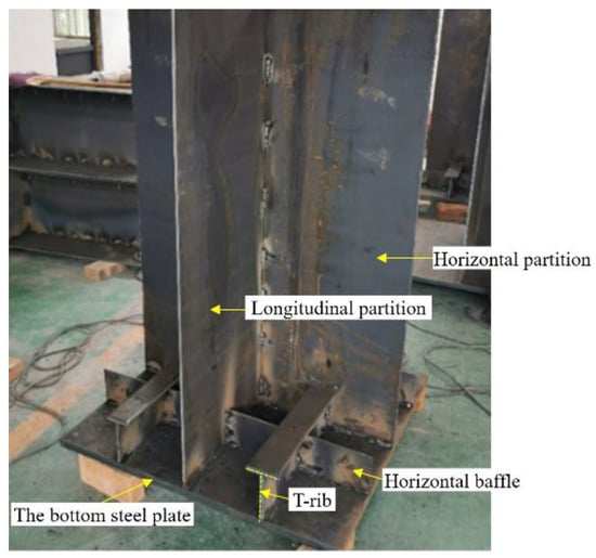 To reflect the temperature transfer law of the tube structure in a fire more truly, the test members and tunnel tube structure should be consistent in terms of geometric size and structural construction. A cube member was composed of an internal steel shell skeleton and an external concrete element, with the dimensions of 1.0 m × 1.0 m × 1.5 m (L × W × H), and its height was the same as the thickness of the top plate of the tube structure. The internal steel shell structure was composed of a top steel plate, a bottom steel plate, a horizontal partition, a longitudinal partition, T-ribs and horizontal baffles, as shown in Figure 5. Among them, the top and bottom plates were made of Q420B steel with a thickness of 30 mm; the horizontal and longitudinal partitions were made of Q390B steel; the T-ribs and horizontal baffles were made of Q345B steel. The external concrete structure was made of C50 high-strength concrete, and the manufactured members are shown in Figure 6.