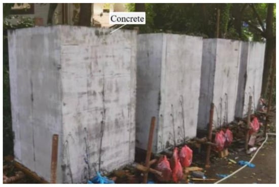 The application of fireproof coating was operated on-site by professional technicians of the coating company. The thermocouples were first laid on the bottom surface of the steel shell, and then the fireproof coating was applied to the bottom surface of the steel shell of the member. The fireproof coating was applied at intervals in layers, with the first coat being 3–4 mm thick and each subsequent coat being 3–5 mm thick. After the second application, the wire mesh was fixed to the surface of the member, the fireproof coating was applied again to the thickness required by the design documents and the final set was moisturized for seven days. Initially, spray maintenance was used, followed by natural maintenance for 21 days. After this, the fireproof coating is formed, as shown in Figure 7a.