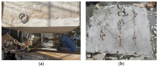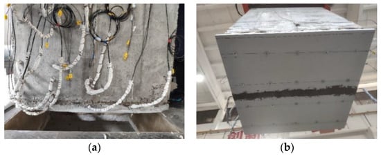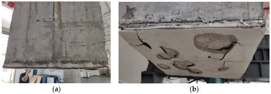In the absence of fire protection measures, the temperature of the lower surface of the bottom steel plate reaches 300.6 °C at 69 s, exceeding the test fire resistance limit (300 °C). The test is stopped at 957 s due to safety hazards, by which time the temperature of the bottom steel plate has reached 1037.2 °C. The member shows significant vertical and transverse cracks after the fire. The concrete bursts from the longitudinal partition of the steel shell in the middle of the member, and the vertical crack is 1.5 m long from the top to the bottom of the member (Figure 11a). Transverse cracks appear in the lower part of the member, extending from the edge to the middle of the member, with the height of the cracks at the edge being approximately 450 mm, higher than the transverse cracks in the middle (Figure 11b).
