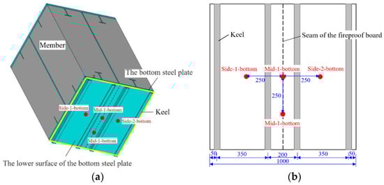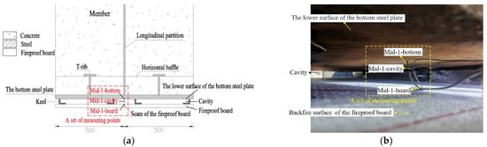 To study the protective effect of the fireproof layers on the tube structure and the influence of the fireproof board’s seam treatment on the steel shell structure, two measurement points, mid-1-bottom and mid-2-bottom, were placed in the middle of the lower surface of the bottom steel plate and were situated directly above the location of the fireproof board’s seam. A measurement point was arranged at 25 cm left and right of the middle-1-bottom, named side-1-bottom and side-2-bottom, respectively. As the fireproof board was indirectly fixed on the surface of the steel shell through the angle steel, there was a certain height of the cavity air layer between the backfire surface of the fireproof board and the bottom steel plate (Figure 9). To study the direction and law of temperature transfer, the measurement points were arranged in the cavity, and the measurement points in the same vertical position were a group. The naming of the measurement points: the bottom position (mid, side)—number (1, 2)—vertical position (bottom, cavity, board). A set of measuring points in the middle, for instance, was given the names mid-1-bottom, mid-1-cavity, and mid-1-board (Figure 10). Different from the installation of fireproof boards, fireproof coatings were directly coated on the bottom surface of the member, so there was no cavity air layer and only the measurement points were arranged at the bottom of the steel shell.