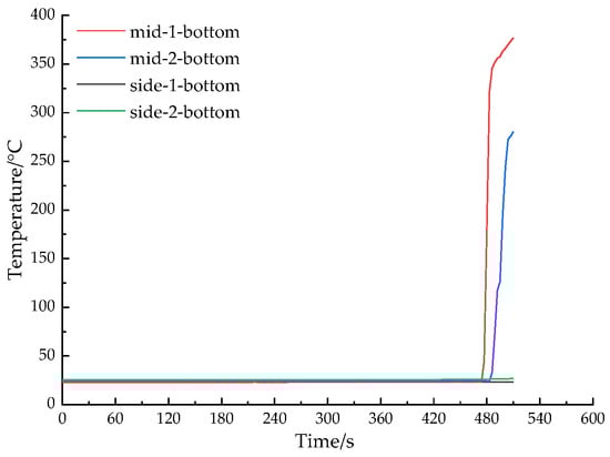 The time-temperature curves of the measuring points at the bottom in the fireproof coating test are shown in Figure 12. The temperature of the mid-1-bottom shows an inflection point at 474 s, which begins to rise sharply from 23.3 °C and reaches 321.5 °C at 483 s, exceeding the fire resistance limit standard. The temperature of the mid-2-bottom shows an inflection point at 483 s and begins to rise steeply from 24.0 °C. At 510 s, the temperature of the mid-1-bottom is as high as 377.0 °C, and the test is stopped for the protection of the member and the safety of the test. At this time, the temperature of the mid-2-bottom is 280.5 °C. According to the temperature rising trend, if the test continues, the temperature of the mid-2-bottom would exceed 300 °C. Throughout the test, the temperature of the side-1-bottom increases from 23.2 °C to 23.3 °C, the temperature of the side-2-bottom increases from 25.4 °C to 26.6 °C, and there is no obvious temperature change at the two measuring points.