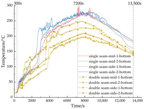 To study the degree of protection of the tube structure by the different fire protection constructions, the surface temperature on the bottom steel plate is analyzed (Figure 15). Under both single-layer and double-layer seam fire protection constructions (referred to as single seam and double seam later), the maximum temperatures of the lower surface of the bottom steel plate do not exceed the specified fire resistance requirement (300 °C). The overall temperature of the measuring points on the surface of the bottom steel plate under the double seam solution is lower than that of the single seam solution, with an average temperature of 61.425 °C lower at each point, indicating that the double seam solution is more effective in protecting the tube structures.