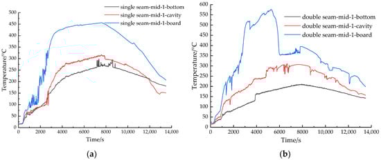 Analysis of all temperature measuring points in the cavity shows that the temperature differences between the measuring points of the mid-1-board, side-1-board, and side-2-board are 120.2 °C, 358.7 °C, and 320.4 °C; the temperature difference of the mid-1-cavity is 6.5 °C; the temperature differences of the mid-1-bottom, mid-2-bottom, side-1-bottom, and side-2-bottom are 67.3 °C, 69.7 °C, 76.4 °C, and 32.3 °C under two working conditions. It is not difficult to find that the temperatures of the measuring points on the backfire surface of the fireproof boards with double-layer seam are higher than those on the single-layer seam condition, but the temperatures inside the cavity and on the surface of the bottom steel plate are lower than those on the single-layer seam condition, and the maximum temperature difference on the backfire surface of the fireproof board has reached 358.7 °C. To investigate this phenomenon, the temperature rise law of the measuring points in the cavity under the double-layer seam scheme was analyzed. Under the double seam scheme (Figure 16b), the temperature on the backfire side of the fireproof boards showed a sharp rise to a peak and then a sudden drop, which does not occur in the single seam scheme. The analysis is because the expansion high-temperature refractory binder used in the seam of the lower layer fireproof board has certain construction defects. At the beginning of the fire, the high-temperature refractory binder has not yet taken effect, and the temperature of the backfire surface of the fireproof board soars. Subsequently, under the action of high temperature, the high-temperature binder is heated and expanded, forming a porous heat insulation layer, which improves the heat insulation effect of the fireproof boards. After this, there is a sudden drop in temperature. This confirms that the upper fireproof board in the double-layer seam construction can effectively act as a secondary barrier to hot smoke in the presence of construction defects in the caulking treatment. However, the measuring points on both sides of the seam on the backfire surface of the fireproof board are higher than the measuring points at the seam. It may be due to the construction method of the double seam so that there is a gap between the two layers of the fireproof boards in the initial test. Alternatively, the deformation of the fireproof boards after encountering heat, the hot smoke enters from the side seam of the two fireproof boards, resulting in the temperature soaring at the measuring points on both sides of the seam on the backfire surface of the fireproof boards.