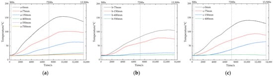 A total of 15 K-type armored thermocouples were pre-buried inside the test member. During the test, the thermocouples were connected to the acquisition module and through the converter to the computer for data acquisition once every 3 s. The pre-buried thermocouple positions were as follows: in the horizontal direction, three measurement sections a, b and c were arranged at equal intervals. Section a was along the longitudinal partition of the member, section b was along the T-rib, and section c was along the outer edge of the member, with the section spacing of 250 mm apart (Figure 8a). In the vertical direction, starting from the upper surface of the bottom steel plate, six observation heights were set vertically upward, which were 0 mm, 75 mm, 150 mm, 400 mm and 550 mm from the upper surface of the bottom plate. The highest observation height of the thermocouple at the steel plate was 700 mm and 550 mm for sections a and b, respectively, and the highest observation height of the thermocouple at the concrete was 400 mm for section c, taking into account that the steel has a stronger thermal conductivity than concrete (Figure 8b). The vertical arrangement of thermocouples was used to examine the change and decay law of temperature along the direction of structure thickness, and the horizontal arrangement of thermocouples was used to study the difference of temperature transmission in steel shell and concrete.