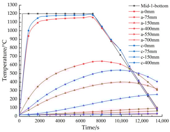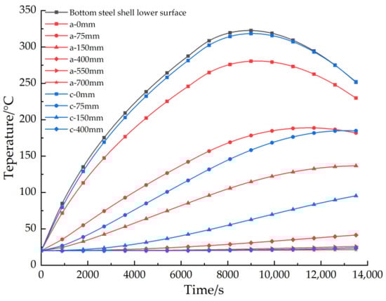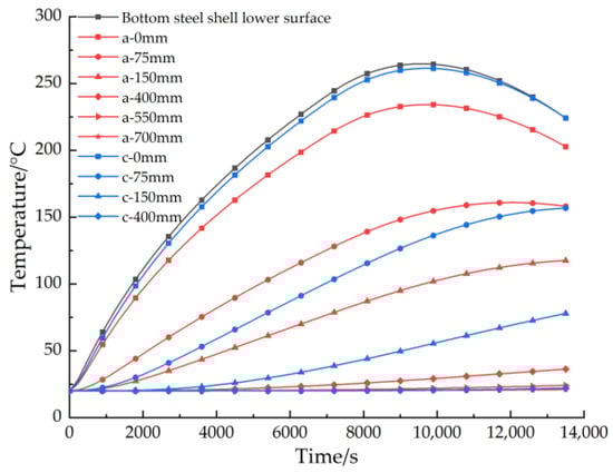 The time-temperature curves of the measuring points at sections a and c inside the member are shown in Figure 22. From the figure, it can be seen that: (1) Without insulation measures, the depth of influence of fire at the steel plate is 700 mm, the depth of influence of fire at the concrete is 550 mm, and the corresponding measuring point temperatures rise from 20 °C to 26.23 °C and 24.14 °C respectively. Additionally, the temperature of the structure above the depth of influence remains at indoor temperature; (2) the heat transfer rate of the steel shell is fast, and the temperature of the lower surface of the bottom steel plate (mid-1-bottom) and the upper surface (a-0mm, c-0mm) are close to each other. The maximum temperatures of a-0mm and c-0mm are 1155.28 °C and 1184.00 °C, respectively, which are 44.72 °C and 16 °C different from the bottom steel plate surface.; (3) the steel plate has a faster heat transfer rate than the concrete, observing the measuring points of the same height temperature, it can be seen that the temperature of the a-0mm and a-75mm is much greater than that of c-0mm, c-75mm at the same time, respectively. The temperature of a-0mm and c-0mm reaches the maximum temperature before that of c-0mm and c-75mm.