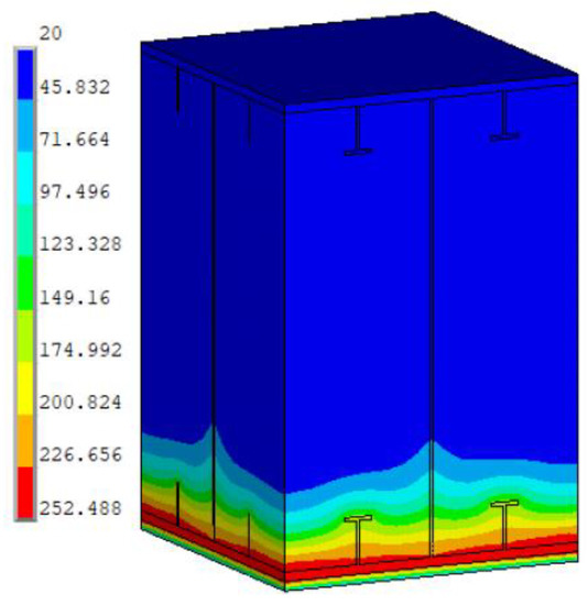 The calculation results of temperature distribution in the tube structure of the test member at 7200 s (120 min) and 13,500 s (when the test stops) are shown in Figure 21. From the figures, it can be seen that: (1) The depth of temperature transfer in the tube structure increases gradually with time. Until the test stops, the maximum depth of fire impact is reached; (2) there is a significant temperature gradient within the member, with the temperature increasing closer to the bottom steel plate; (3) the thermal boundary is uniformly exposed to fire, due to the symmetry of the structure of the member, the temperature distribution is symmetrical along the central longitudinal partition axis. The temperature distribution at the steel shows a convex shape: The depth of temperature influence is greatest at the central steel plate, followed by the T-rib, and lowest at the concrete on both sides; (4) as can be seen from Figure 21a, the temperature distribution fluctuates significantly closer to the steel structure, with a significant temperature ‘spike’ at the steel. This means that the steel temperature is greater than the concrete temperature at the same horizontal depth; and (5) as can be seen from Figure 21b, there is a residual temperature inside the member when the test stops, with a maximum value of 442.31 °C, distributed on both sides of the T-rib.