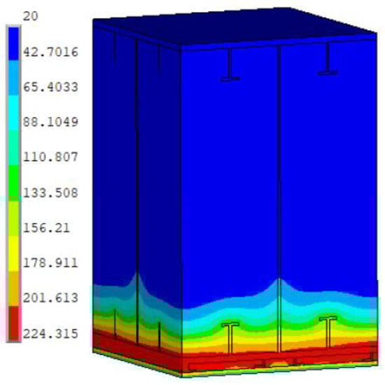 Under the protection of fireproof coatings, the depth of fire effect is 550 mm for steel plates and 400 mm for concrete, with a-550mm and c-400mm rising from 20 °C to 25.81 °C and 23.68 °C respectively (Figure 23). The reduced depth of fire temperature impact compared to that of the members without insulation indicates that fireproof coatings have a significant effect on the fire protection of the tube structure. However, the maximum surface temperature of the bottom steel plate is 322.45 °C (Figure 24), which exceeds the fire resistance limit temperature criteria.