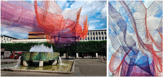 Previous research on textile architecture has commonly focused on tensile textile architecture, with the textile immobilized and tensioned to secure its load-bearing functionalities [20]. However, more loosely fitted textiles open up other design options and functions. These include the large-scale textile structures by Janet Echelman that take advantage of being shaped by wind, e.g., the sculpture 1.78 Borås, which was made with flexible knotted nets (Figure 1). Another example of architectural textiles shaped by the wind is the knitted design prototype (in)Formed by Wind by one of the authors of this article (Figure 2). Further examples of exterior loose textiles embrace the fabric façade of a studio house in Almere, the Netherlands, by CC-Studio, Studio TX, and architect Rob Veening; the Book House Pavilion by Olga Sanina and Marcelo Dantas, two architects; the COS Space by Snarkitecture; and knitted structures such as Lumen by Jenny Sabin.