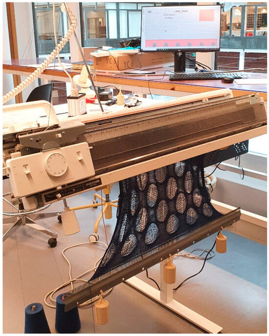 The models were knitted with cotton yarns (2 × 20/2Ne, i.e., 2 strands of 2 ply 20 Ne knitted together), on a Silver Reed SK840 knitting machine (4.5 mm standard gauge; shown in Figure 4), using the DesignaKnit 9 software for pattern design. All models were knitted with a width of 160 stitches (loops), and at least 160 rows were knitted. The number of rows depended on how long the models became with the chosen loop sizes. The patterns are variations of drops-stitch that comprised 160 by 160 stitches, with a few rows of plain knits (single jersey) knitted before and after the pattern.