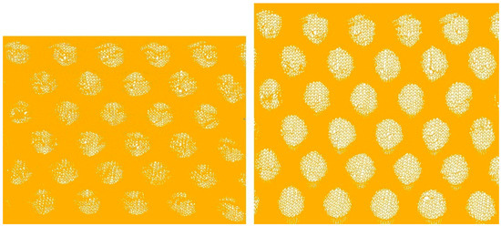 Drop-stitch 10% unstretched (left) and stretched on a frame (right), resulting in differing porosities, 0.11 and 0.21, respectively. The parts that are calculated as impermeable are shown in yellow.