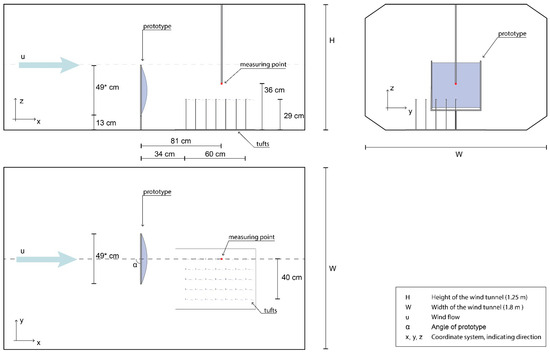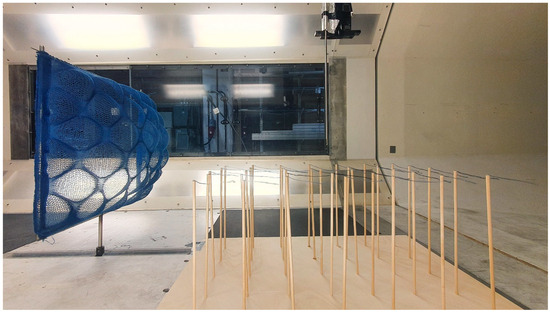 Three methods could be potentially relevant in the context of assessing the performance of architectural windbreaks: full-scale tests (preferably on-site), computational fluid dynamics (CFD) analysis and physical wind tunnel tests. All of these methods have pros and cons. There are examples of full-scale wind tests [23,26,28], but project/site-specific tests are usually impractical and costly. Hence, with the increase in computational power today, CFD analysis is becoming increasingly popular [29]. The different computational approaches used to simulate the wind could be divided into mesh-based methods, which are most frequently used, and mesh-free/particle-based methods, such as SPH—smoothed particle hydrodynamics [30,31,32,33]. However, computer simulations are still computationally costly to run, especially if, as in the case of windbreaks, turbulence occurs, and it is a fluid–structure interaction (FSI) problem. In this case, the textile and the wind are interacting in a coupled manner by mutually affecting each other, making such simulations particularly computationally expensive. For problems like the one presented in this article, with a loose textile that is both porous and deforming considerably, it is close to impossible to accurately simulate the behavior in a computer model. Thus, the more traditional physical wind tunnel tests are considered to be a better option. Even so, the wind tunnel experiments also have their limitations, mainly due to the dimensional restrictions often necessitating the use of scale models instead of full-size prototypes.