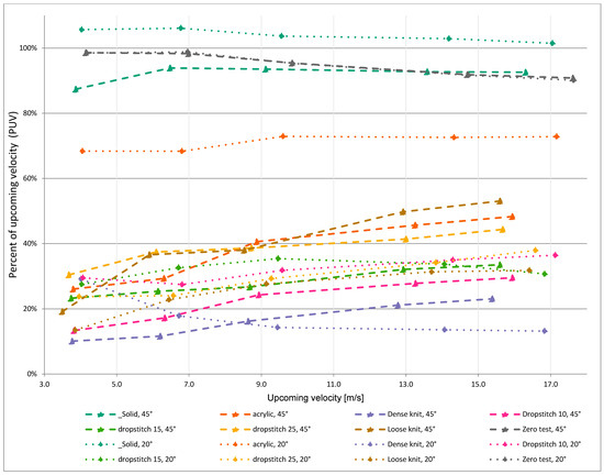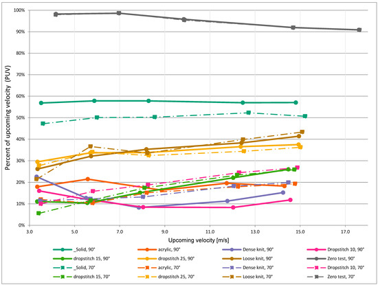 Percent of upcoming velocity (PUV) for the screens positioned at an angle of 70° and 90° to the wind.