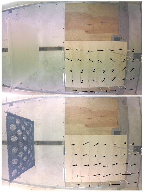 For the knitted models, the wind speed was reduced by around 60–90% at the position of the hot-film anemometer (Figure 8). This can be compared with the nonporous model, which reduced the wind by approximately 40% at a 90° angle (Figure 10). It should be noted that the hot-film anemometer, which was used to measure the velocity of the wind, does not give information about wind direction. For the case with the solid screen at a 90° angle, it is evident that the wind had changed direction, judging by the tufts placed behind the screens, as can be seen in Figure 11. A significant difference between the solid screen and the knitted ones, in terms of percentage of upwind velocity (PUV), was observed for the models positioned at an angle of 20° (Figure 12). For those models, the knits reduced the wind to 13–36% of the applied velocity, whereas the solid screen generated an increased velocity. Moreover, the PUV for the perforated board, positioned at an angle of 20°, was significantly higher compared to the knitted models. The highest reduction in windspeed was measured for the drop-stitch model and the densely knitted model when placed at a 90° angle and at a windspeed of 8 and 12.5 m/s, reducing the windspeed with 92% (Figure 10).