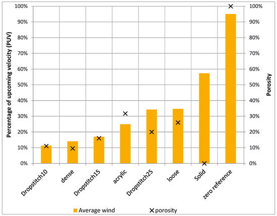 In Figure 13, the prototypes in the chart are arranged by increased PUV, which shows that the drop-stitch 10%, the densely knitted and the drop-stitch 15% prototypes perform best in terms of reducing the wind. In the chart in Figure 13, the calculated optical porosity for each model is also visualized, indicating a low correlation between porosity and PUV. This can be compared with the chart in Figure 14, where the values are arranged according to increasing calculated optical porosity. Here, no clear trend can be seen, implying that the calculated porosities are either wrong or that optical porosity is not a good tool for describing or comparing the models. However, by instead using the calculated optical porosity for the unstretched drop-stitch 10% knit and only including the knitted prototypes, as in Figure 15, the trend suggests that the optimal optical porosity is around 10% for the type of knitted models presented in this study. This could be compared with previous studies, which found that the optimal porosity for porous windbreaks is in the span of 20–35% [11,22,25], implying that the knitted models follow a different pattern than the nonflexible screens. The perforated board (acrylic) had a porosity of 32%, thus falling within the presented span from previous research, and, as can be seen in Figure 13 and Figure 14, it does perform well in terms of reducing wind.