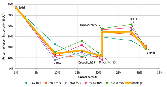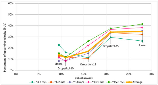 Percentage of upcoming velocity (PUV) depending on the calculated optical porosity, using the value for unstretched drop-stitch 10%.