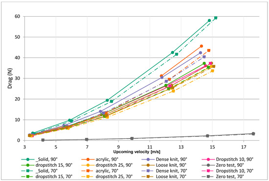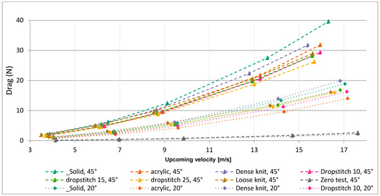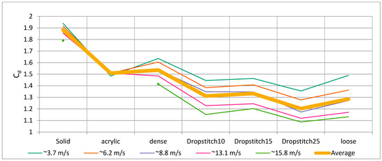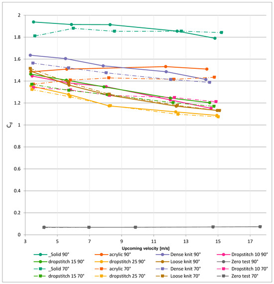 where , which is the frontal area, , projected perpendicularly to the wind direction; is the incoming wind velocity; is the force from the wind on the windbreak (drag force); and is the air density. For the knitted models placed at a 90° angle, the drag coefficient (Equation (1)) is decreasing with higher wind velocities, meaning that the applied wind load (drag force) on the prototype is lower in relation to the increase in wind velocity. This could be compared with the drag coefficient for the solid screen and the perforated board (noted as acrylic in the charts), which has a more constant value (as is expected). The decreasing drag coefficient is likely a result of increased porosity caused by the stretch of the textile with increased wind load.