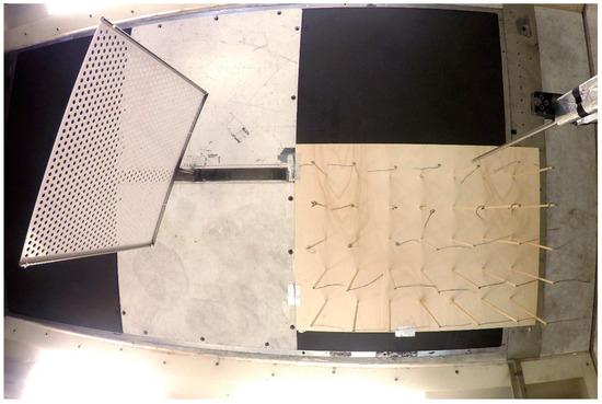 The setup in the wind tunnel can be seen in Figure 8 and Figure 9. All the models were mounted on a steel frame, with all members having a circular cross-section of 10 mm. The frame was mounted on a six-component balance located under the floor outside of the wind tunnel test section (Figure 8). The top and bottom of the textiles were held in place by a smaller steel rod (diameters: 3 mm and 2 mm). The total weight of the frame was 966 g.