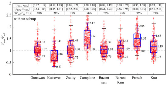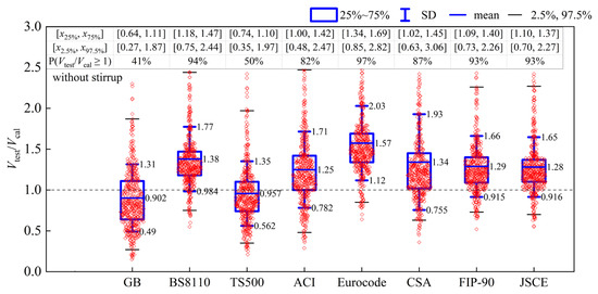 In this section, the evaluation results of the 16 shear strength models based on the experimental database containing 781 RC slender beams are presented. The calculated results of the specimens without and with stirrup are given in Figure 1, Figure 2, Figure 3 and Figure 4. The horizontal axis is the number of each model, and the vertical axis is normalized predictive shear strength (the ratio of the test shear strength to the calculated shear strength Vtest/Vcal). The statistical indicators adopted to evaluate the models include the mean value, standard deviation, minimum value, maximum value, and quantiles. The whiskers represent the standard deviations (St.D), while the dots represent the means of the Vtest/Vcal. The standard deviation reflects the trend of data dispersion, whereas the mean reflects the trend of data concentration. The lower and upper lines of a plot stand for the normalized strength values at 25% and 75% quartiles (x25% and x75%), respectively. These values are shown in the first row of the table in each figure ([25%, 75%]). The other two lines stand for the values of the data at 2.5% quartiles (x2.5%), and 97.5% quartiles (x97.5%), respectively. These values are shown in the second row of the table ([2.5%, 97.5%]). Furthermore, the frequency of the Vtest/Vcal ≥ 1.0 (P(Vtest/Vcal ≥ 1.0)) is shown in the third row. If the percentage of the ratio between the experimental value and the predicted value is greater than one, the model is assessed to be safe.