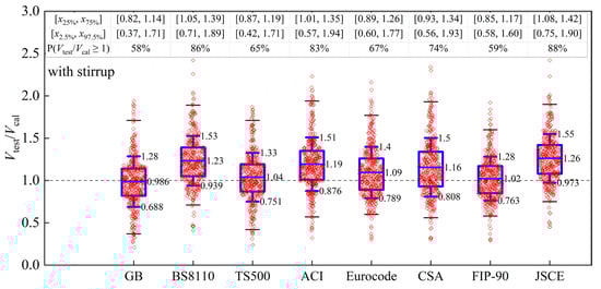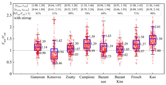 Among the above models, Gunawan’s prediction results [60] are closer to the horizontal line at Vtest/Vcal = 1. Thus, Gunawan [60] is more accurate. Gunawan [60] considers the effect of concrete strength on shear strength by introducing a parameter of (f’c)1/3 based on the model of JSCE [3]. When predicting the RC slender beams with stirrup, the model of Bazant et al. [40] is more accurate than the rest of the models because its average strength ratio is closer to 1.0, and the standard deviation and quartile range are smaller than other models. This may be due to the fact that Bazant et al. [40] applies fracture mechanics to the extension of mortar cracks in the contact area between large aggregate pieces, correlating the concrete strength with the maximum aggregate size.