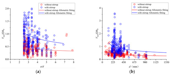 The interval division of the shear span-to-depth ratio is mainly based on the analysis result of Subhan Ahmad’s study [55], and the trend of nominal shear stress versus shear span-to-depth scatter distribution is shown in Figure 5a, which finally takes 3.5 as the distinction.