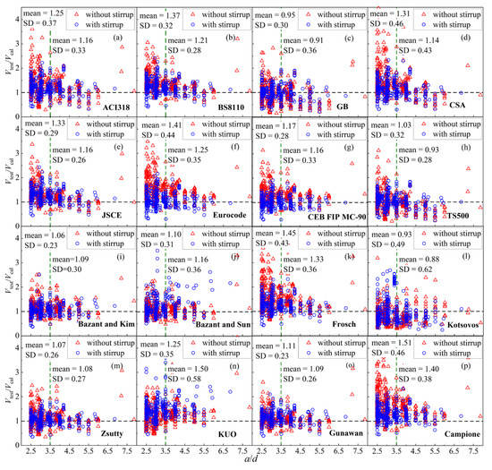The relationship between the ratios (Vtest/Vcal) and shear span-to-depth ratio of (a) ACI318; (b) BS8110; (c) GB; (d) CSA; (e) JSCE; (f) Eurocode; (g) CEB FIP MC-90; (h) TS500; (i) Bazant–Kim; (j) Bazant–Sun; (k) Frosch; (l) Kotsovos; (m) Zsutty; (n) Kuo; (o) Gunawan; (p) Campione.