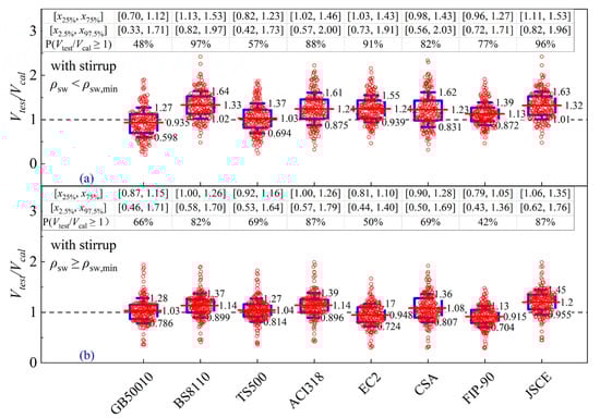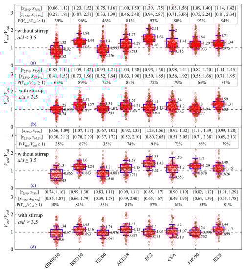 From Figure 6a–h, it can be clearly observed that most predicted values by the models of codes are distributed above the line of Vtest/Vcal = 1 for a/d < 3.5, except for GB 50010 [23] and TS500 [57]. As can be seen from Figure 7, the safety percentiles predicted by EC2 [4] and CEB-FIP MC90 [30] are sensitive to stirrup, which drop from 97% to 92% for beams without stirrup and from 72% to 63% for beams with stirrup. Furthermore, the mean normalized values predicted by BS8110 [38] and CSA A23.3 [34] show significant variations in the cases of stirrups or not, although the predictive safety percentiles obtained from both models are high. The mean values obtained by BS8110 [38] and CSA A23.3 [34] are significantly influenced by the appearance of stirrup. The models of ACI 318 [2] and JSCE [3] present uniform mean values and relatively high safety estimation under a/d < 3.5.