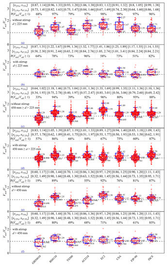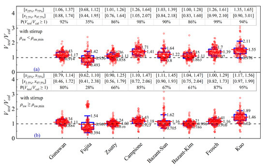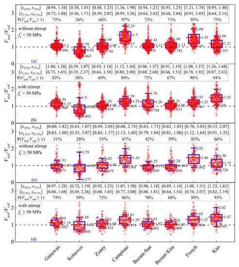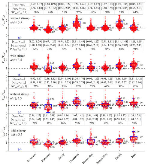 The models of Bazant et al. [40], Zsutty [36], and Gunawan [60], are independent of reinforcement types and are further accessed to investigate their sensitivity to a/d. For the beams under a/d < 3.5, it can be seen from Figure 6a,m,o that the predicted values of the three models are evenly distributed around the Vtest/Vcal = 1.0. The calculated mean value and standard deviation obtained by Bazant et al.’s model [40] are 1.06 and 0.23, respectively, and those obtained by Zsutty’s model [36] are 1.07 and 0.26, respectively, but those obtained by Gunawan [60] are 1.11 and 0.23, respectively. Moreover, the models of Bazant et al. [40] and Zsutty [36] provide the most reasonable prediction results at the given range of shear span-to-depth ratio (i.e., 2.5 < a/d < 3, and 3 < a/d < 3.5). A conclusion can be drawn from Figure 8a,b that the models of Bazant et al. [40], Zsutty [36], and Gunawan [60] are more accurate with less discreteness by judging from the predictive values of [x25%, x75%] and [x2.5%, x97.5%] versus other models. From the comparison results of the above three models, it is shown that the models of Bazant et al. [40] and Zsutty [36] exhibit similar mean values, which are closer to 1 than Gunawan [60]. It is thus believed that the models of Bazant et al. [40] and Zsutty [36] are most accurate for RC slender beams under a/d < 3.5. With the increasing span-to-depth ratio (a/d ≥ 3.5), the models of Gunawan [60] and Zsutty [36] provide more accurate prediction than Bazant et al.’s model [40], which can be seen from the fact that the mean values are close to 1.0, associated with smaller interquartile ranges and limits. It can also be seen from Figure 8 that the accuracy of Bazant et al.’s model [40] is more sensitive to stirrup than the other two models.