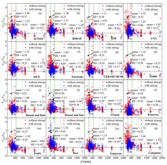 The relationship between the ratios (Vtest/Vcal) and effective depth of (a) ACI318; (b) BS8110; (c) GB; (d) CSA; (e) JSCE; (f) Eurocode; (g) CEB FIP MC-90; (h) TS500; (i) Bazant–Kim; (j) Bazant–Sun; (k) Frosch; (l) Kotsovos; (m) Zsutty; (n) Kuo; (o) Gunawan; (p) Campione.