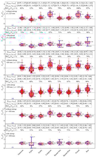 According to Figure 15i–p, the strength ratios obtained by the models of Zsutty [36] and Bazant et al. [40] are uniformly distributed along the horizontal line and become more concentrated with the increase in . As presented in Figure 17a, when predicting the beams with , the mean values and standard deviations obtained from the models of Zsutty [36] and Bazant et al. [40] are found to be both equal to 1.15 and 0.22, respectively. However, the quartiles range from Zsutty’s model [36] is 0.25, which is smaller than that from Bazant et al.’s model [40] (0.28), but when predicting the beams with , the results are somewhat different. Bazant et al.’s model [40] yields an average strength ratio of 0.996, which is closer to 1.0 compared to the average strength ratio of 1.026 obtained by Zsutty’s model [36]. In addition, the range of 2.5% and 97.5% quartiles obtained by the model of Bazant et al. [40] is 0.84, which is smaller than the one given by Zsutty [36] of 0.91.